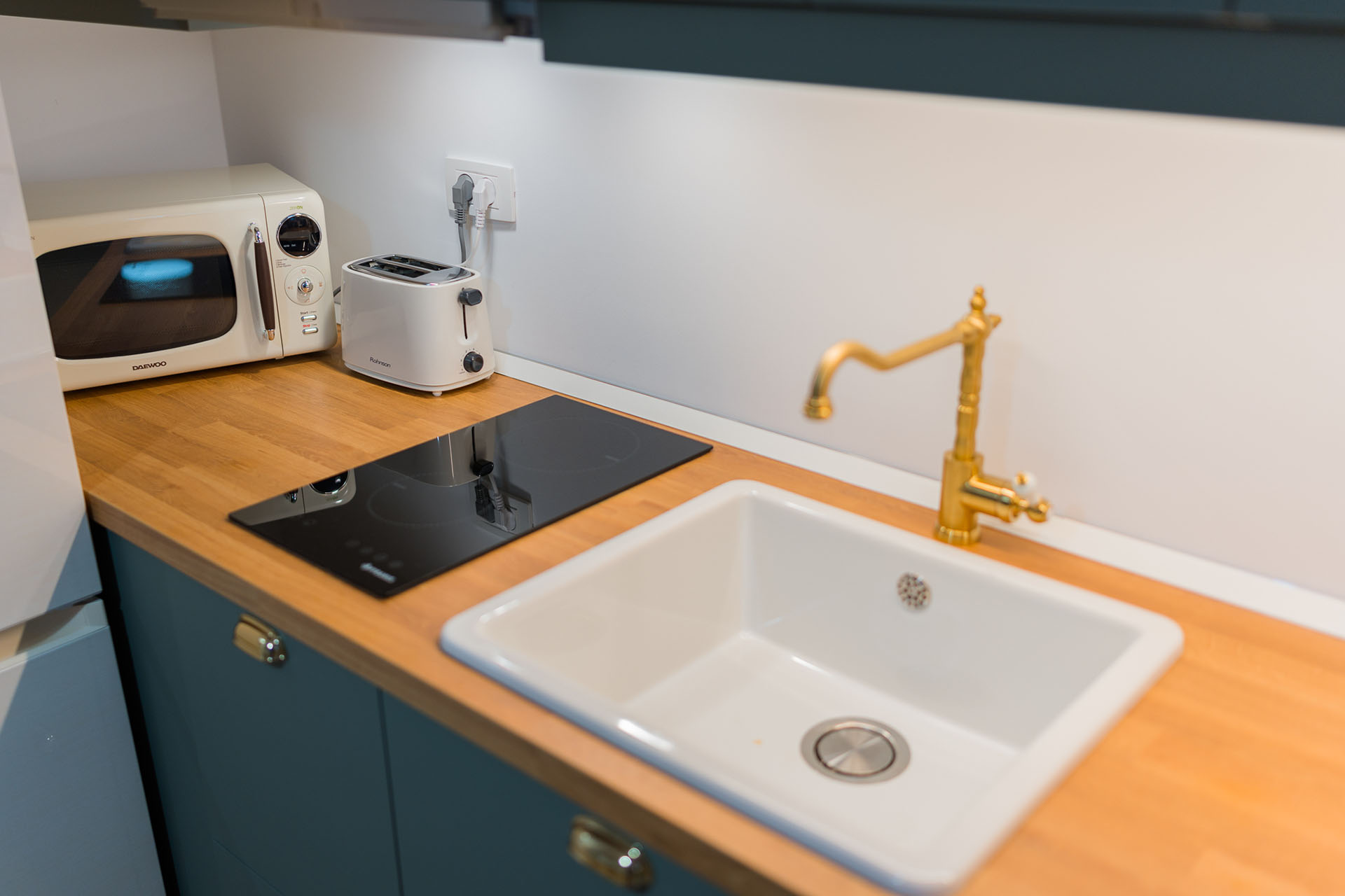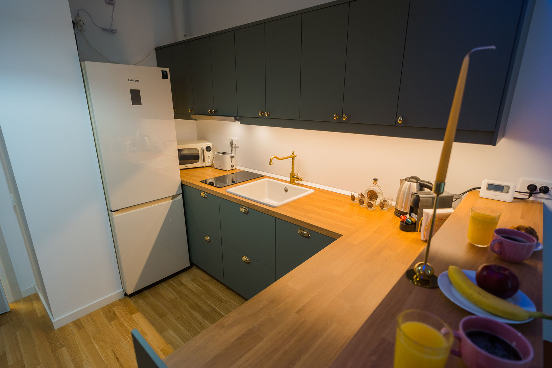 Kitchen is equipped with an oven, hot plate, refrigerator and freezer, washing machine and other small appliances: toaster, kettle and an espresso machine.